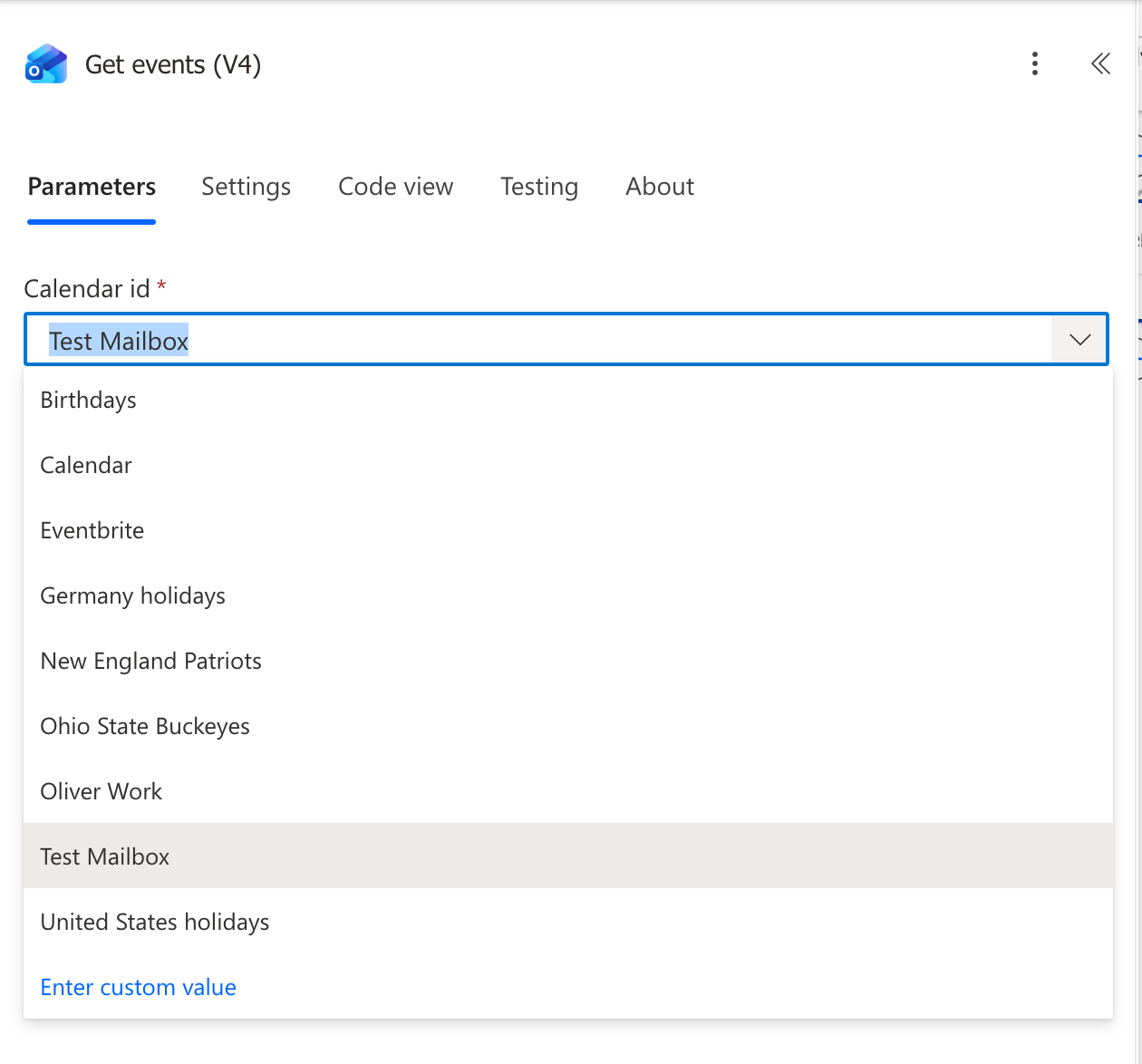 - Open the Get events (V4) action (Office 365 Outlook).