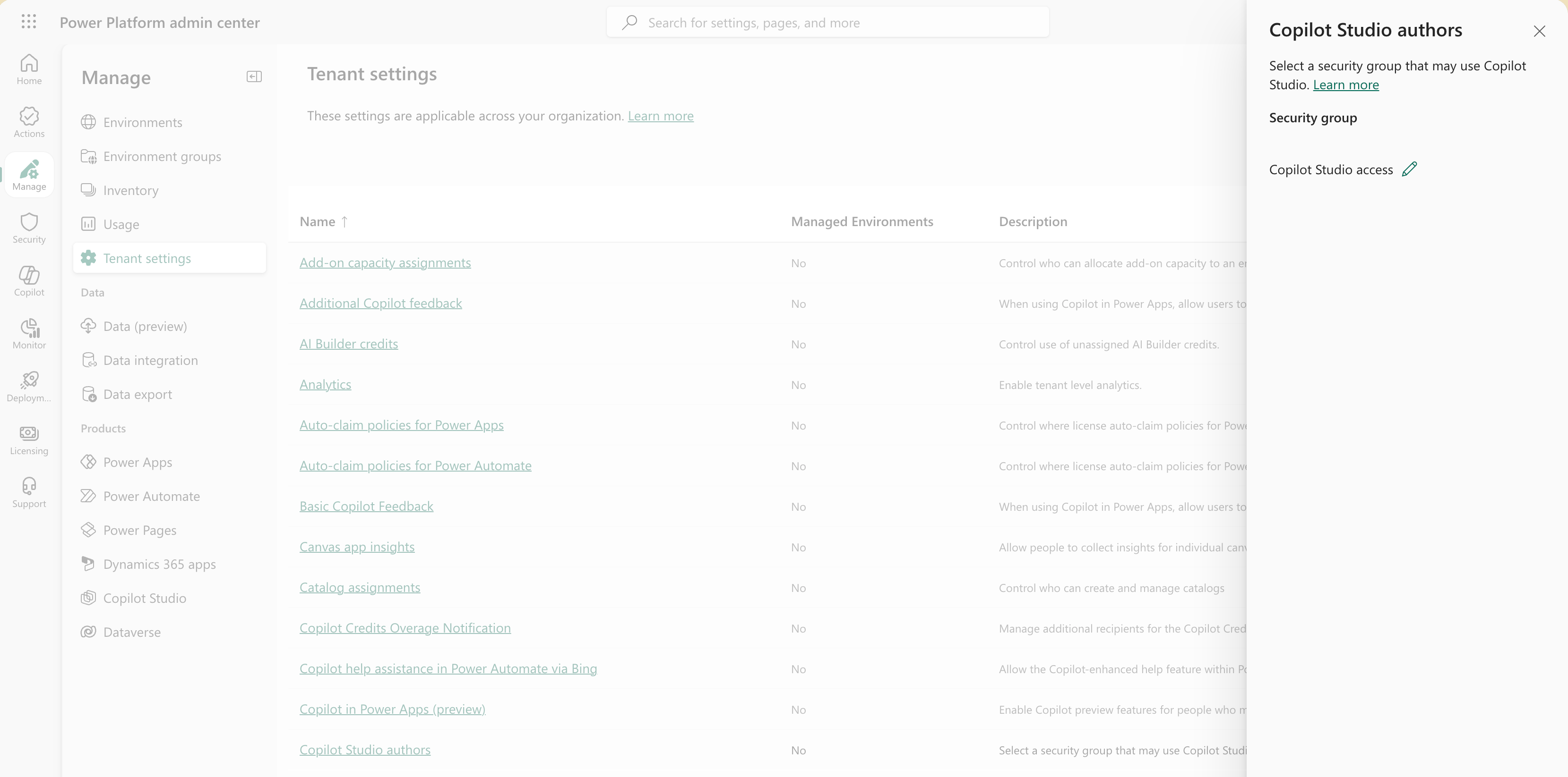 The Power Platform Admin Center gives you a tenant-level setting to restrict Copilot Studio authoring to a specific group of users.