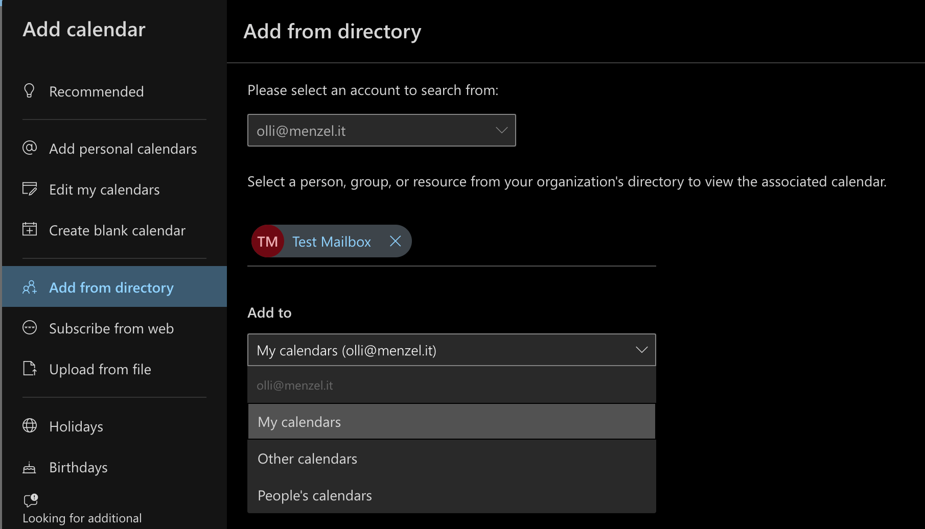 Test Mailbox). - Choose where to add it (for example, under My calendars).
